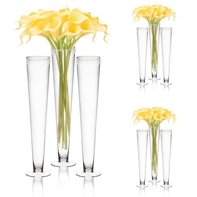 Display for variety of Events - This 24 inch tall clear glass trumpet vase displays a clean straight-sided body sloping gradually to a circular base. This flower trumpet vase is one of the most popular vases among wedding designers and DIY brides because its minimal inverted triangular silhouette is a great modern style and endlessly versatile. For brides looking for an all-around functional wedding centerpiece vase, this may be the vase. Many luxuriant hydrangea arrangements, simple long stem flowers and branches, or dreamy rosebud topiary designs have been used with this trumpet vase. The size of this vase is suitable for events that call for modern elegance. One may see this trumpet vase used in upscale hotels and gala events.